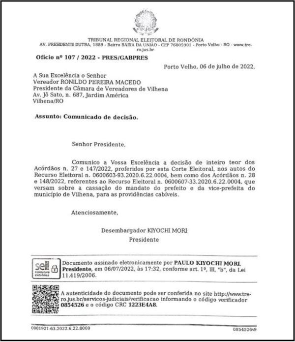 O desembargador Kiyochi Mori, presidente do Tribunal Regional Eleitoral de Rondônia (TRE/RO) enviou ofício ao presidente da Câmara de Vilhena, Ronildo Macedo (Podemos) para providências cabíveis quanto ao afastamento imediato do cargo do prefeito Eduardo Japonês (PSC) e de sua vice Patrícia da Glória.