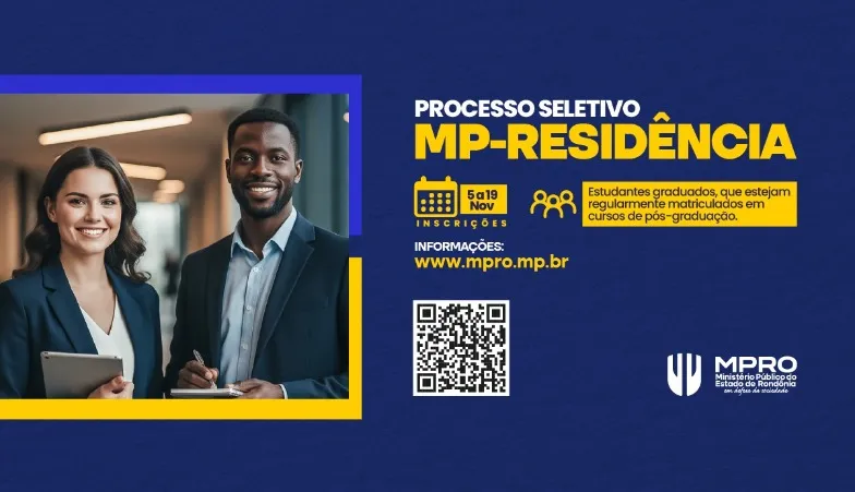 O Ministério Público do Estado de Rondônia (MPRO) anuncia a abertura de inscrições para dois editais do Programa MP-Residência, iniciativa voltada a graduados em curso superior que estejam cursando pós-graduação em áreas específicas. Os processos seletivos, regidos pelos Editais SEI nº 1/2025/SG e nº 2/2025/SG, estão com inscrições abertas de 5 a 19 de novembro de 2025, exclusivamente pelo Portal do Estagiário e MP-Residente, disponível no site do MPRO