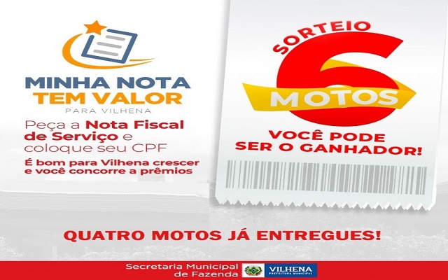 Mais um prêmio do programa “Minha Nota Tem Valor Para Vilhena” será entregue na próxima semana na Secretaria Municipal de Fazenda (Semfaz). A moto zero km é o quarto veículo a ser sorteado na cidade pela Prefeitura de Vilhena em incentivo à solicitação de notas fiscais de serviço pelos consumidores no município. As próximas duas motos serão entregues em dezembro e todos podem participar.