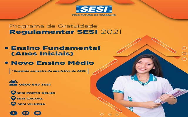 O Serviço Social da Indústria de Rondônia (SESI-RO) está com inscrições abertas para o preenchimento de 143 vagas ofertadas gratuitamente para o Ensino Fundamental e o Novo Ensino Médio nos colégios SESI de Porto Velho, Cacoal e Vilhena. As inscrições podem ser feitas de forma online no Portal do SESI.