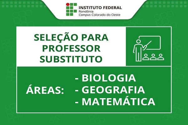 Estão abertas as inscrições para o Processo Seletivo Simplificado para a contratação de professores substitutos para o Instituto Federal de Educação, Ciência e Tecnologia de Rondônia (IFRO), Campus Colorado do Oeste. Há uma vaga para cada área: Biologia, Geografia e Matemática.