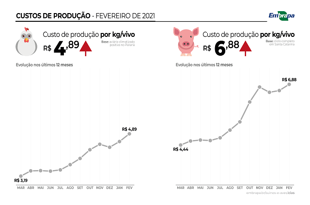 Os custos de produção de frango de corte e de suínos continuam subindo em 2021. Apenas em fevereiro, os custos para os frangos de corte aumentaram 6,89%, enquanto que para suínos a alta foi de 3,74% em relação a janeiro. Os números são da CIAS, a Central de Inteligência de Aves e Suínos da Embrapa, que disponibiliza as informações no site embrapa.br/suinos-e-ave/cias.